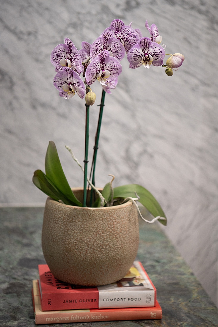 Inspire creativity and encourage peace of mind with a purple spotted orchid. Bright and colourful, this orchid has an elegant single stem and rich purple spotted flowers. Typically, your Phalaenopsis orchid will bloom for around 3 months each year. You will likely find some blooms already on your orchid upon delivery. These will then open up further in a warm indoor setting.